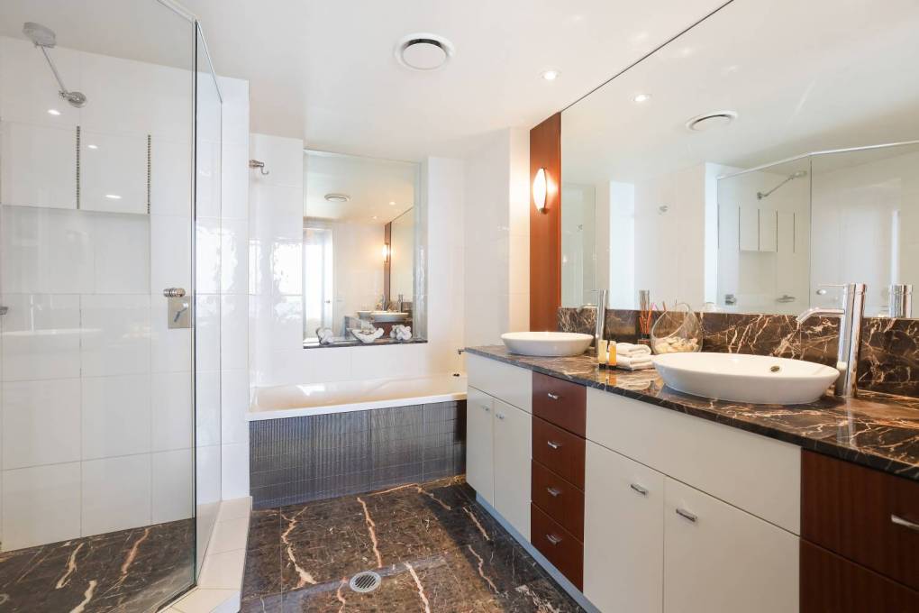 The master bedroom's ensuite bathroom has a double hand basin with granite finishes, bathtub, full length shower, toilet, and hair dryer.