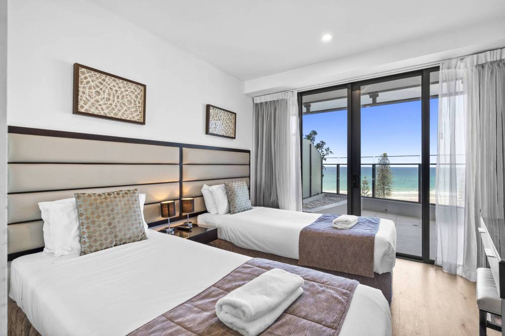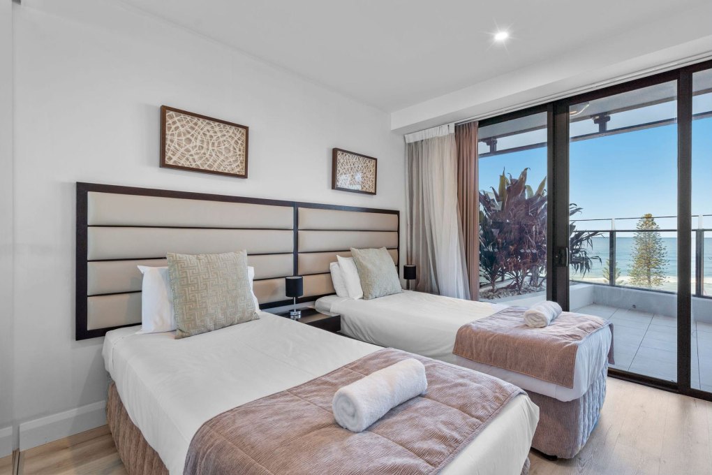 The second bedroom contains two single beds, balcony access and wonderful ocean views.