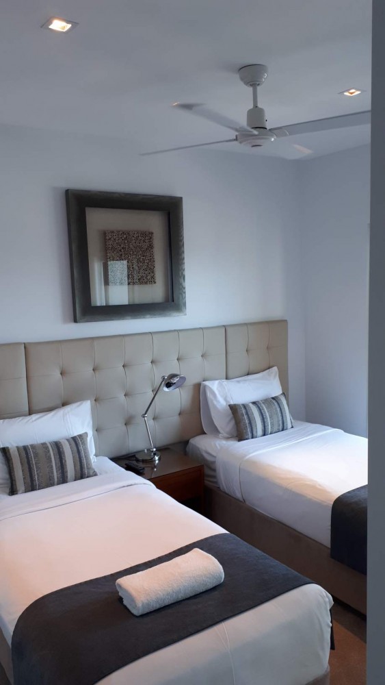 The third bedroom contains two single beds, balcony access and wonderful city and hinterland views.