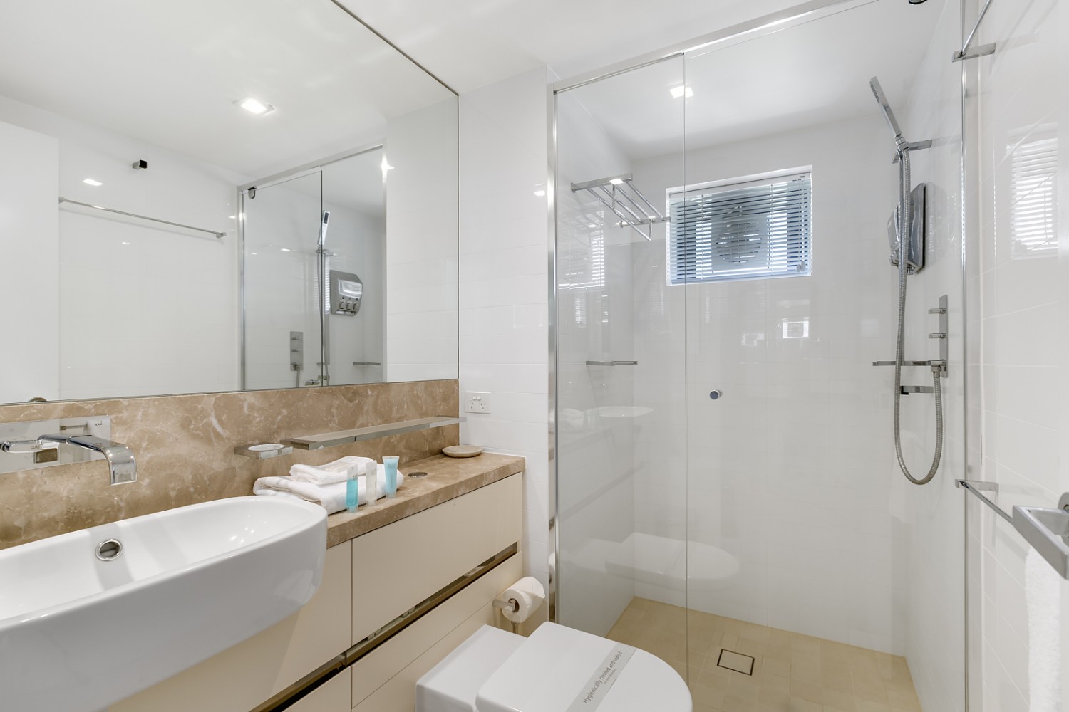The main bathroom contains a shower, toilet, basin and a hairdryer.