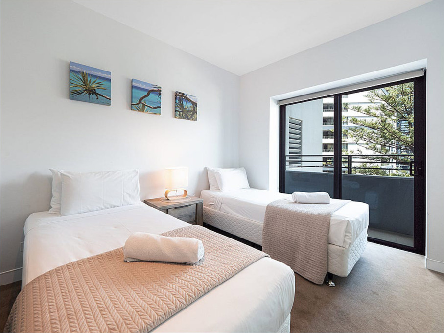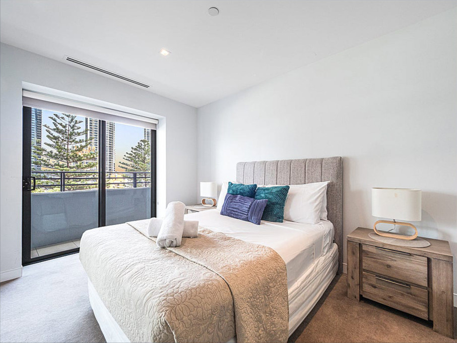 Bedroom three contains 1 Double bed, balcony access and views of Surfers Paradise and the Nerang River.