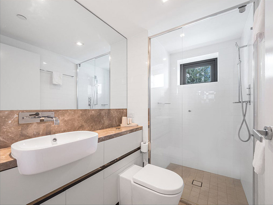 The main bathroom contains a shower, toilet, basin and hairdryer.