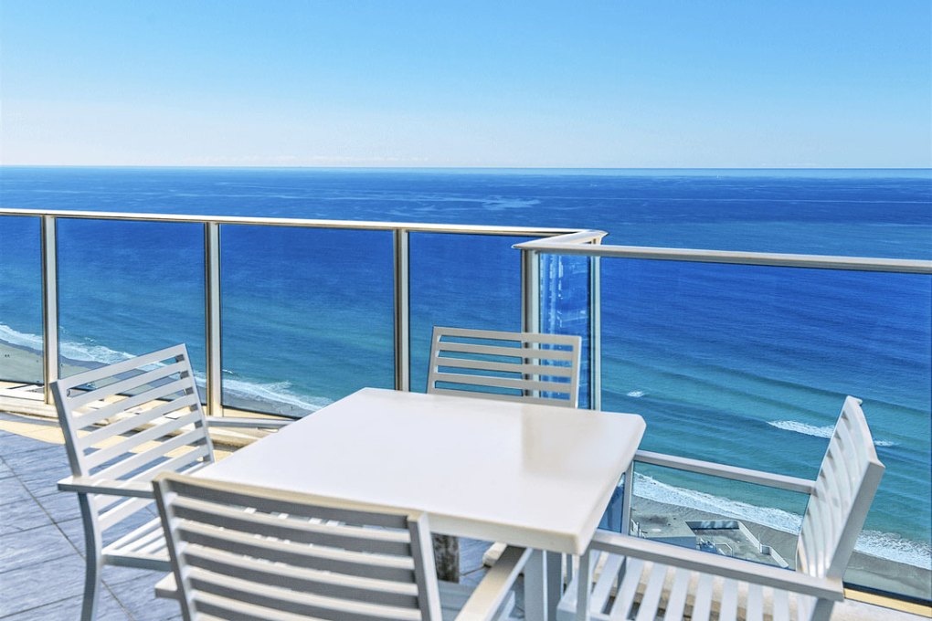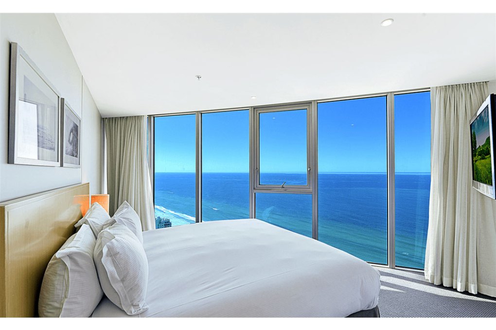 The master bedroom contains a King bed, walk-in robe, TV, and an ensuite bathroom. It also has a northerly aspect over the Gold Coast beaches with floor to ceiling glass windows to enjoy the Pacific Ocean view.
